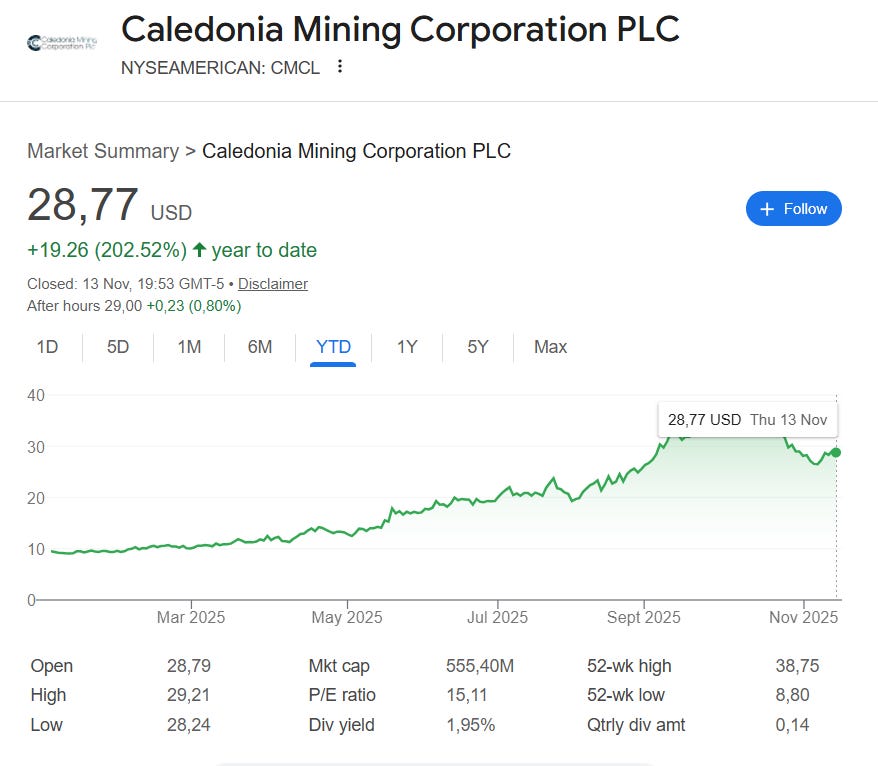 Caledonia Mining’s stock has tripled in 2025, making it one of the best-performing gold miners on both the Victoria Falls Stock Exchange and the NYSE American.
