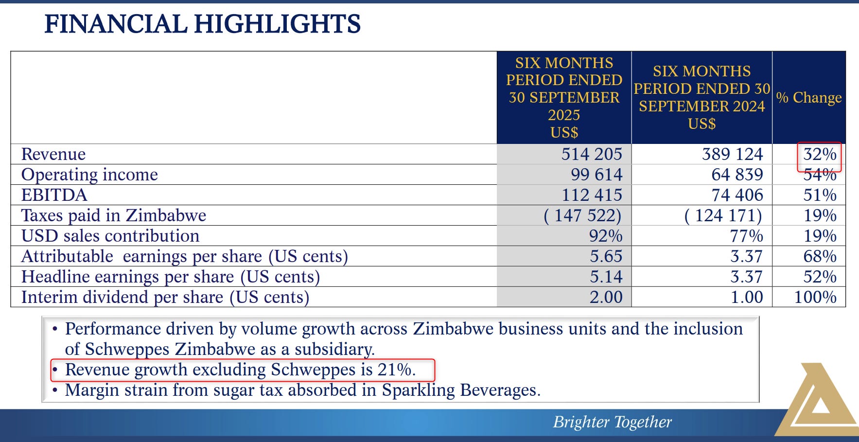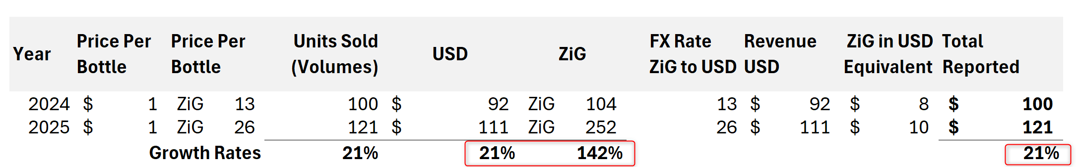 The ZiG revenue increased by 142%, mainly due to the exchange rate change from 13 to 26, combined with the 21% volume growth.