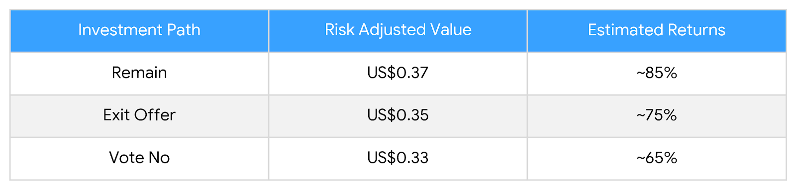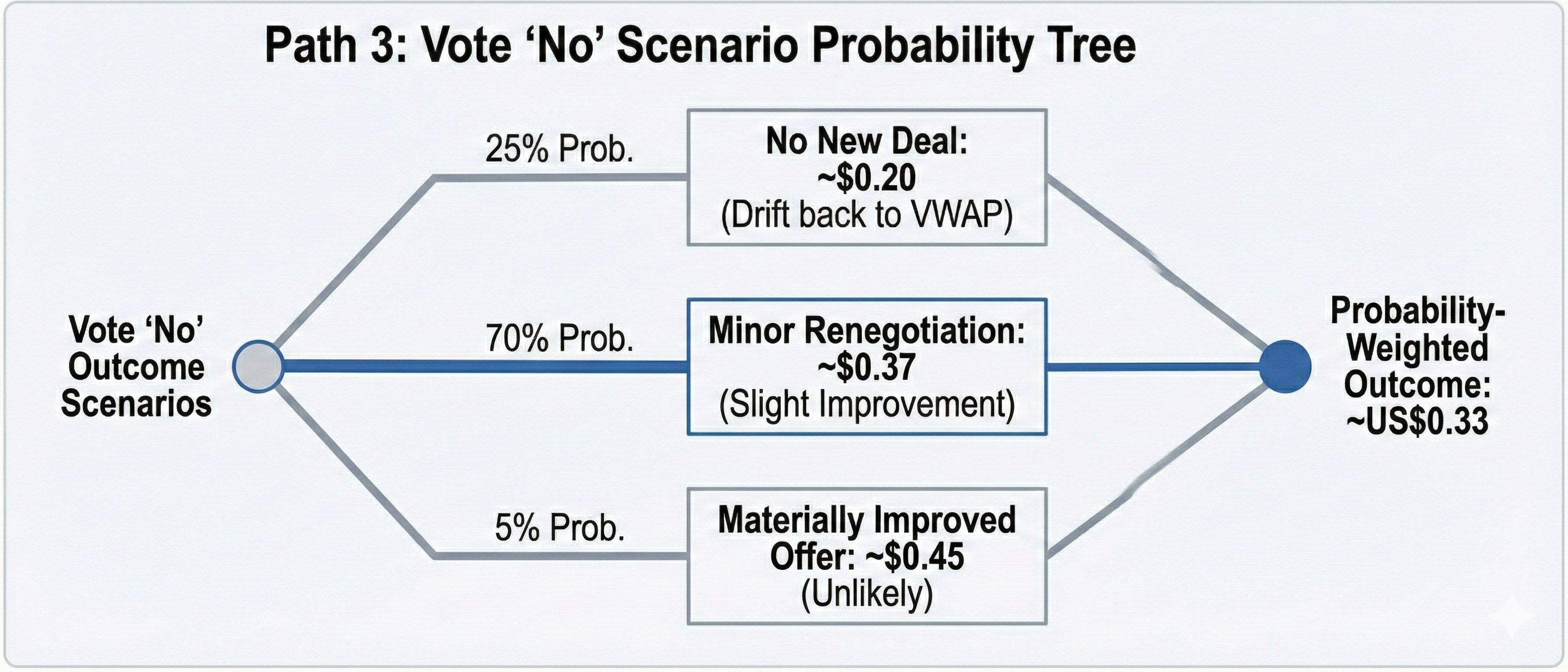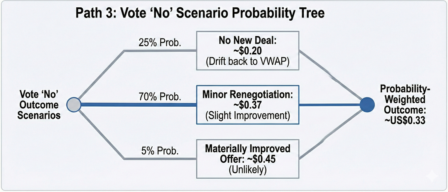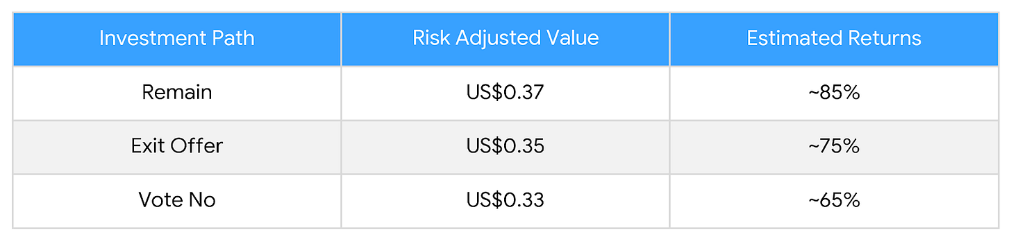 Voting no is the most complex of the three. Our probability-weighted analysis puts it at approximately US$0.33 below the exit offer in expected value, and with significantly more variance around that number