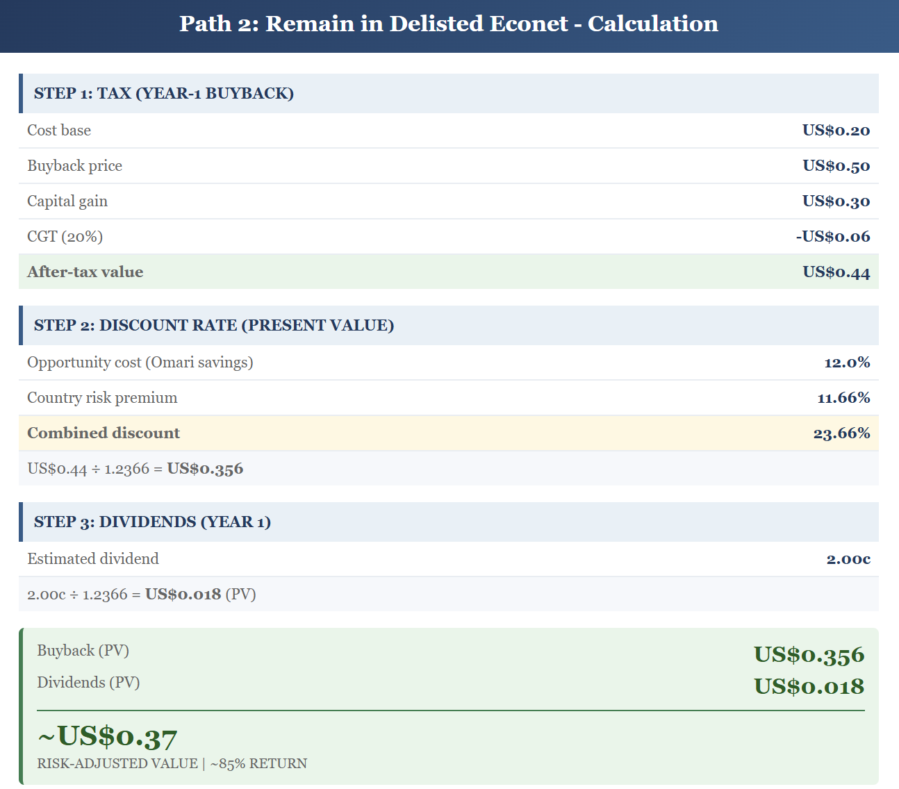 For all calculations, we will use the 30-day VWAP of US$0.20 as our reference cost price. The VWAP (Volume Weighted Average Price) is basically the real value Econet shares actually traded at before the talk of corporate actions and delisting started.