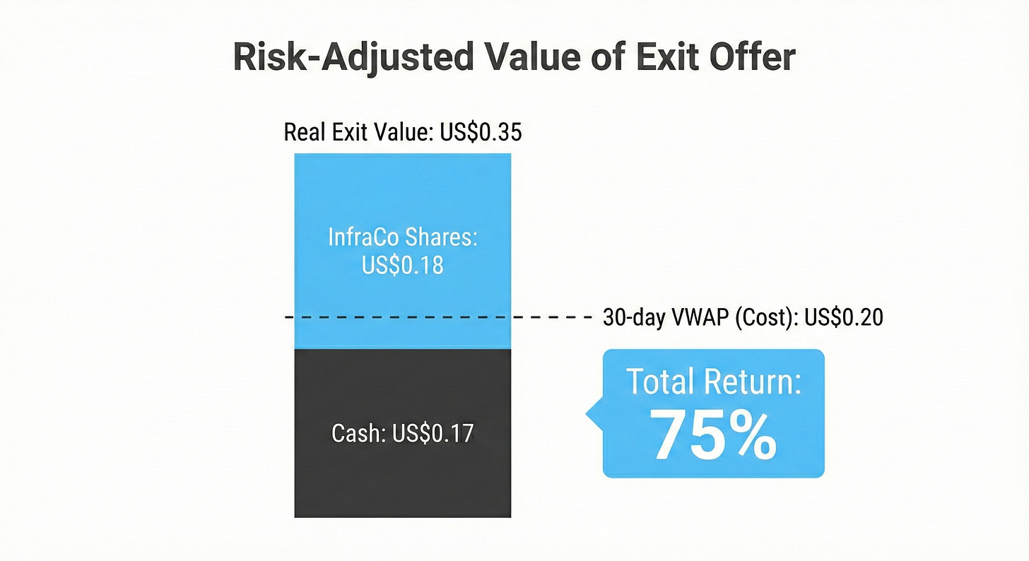 Cash US$0.17 + InfraCo shares US$0.18 = real exit value US$0.35