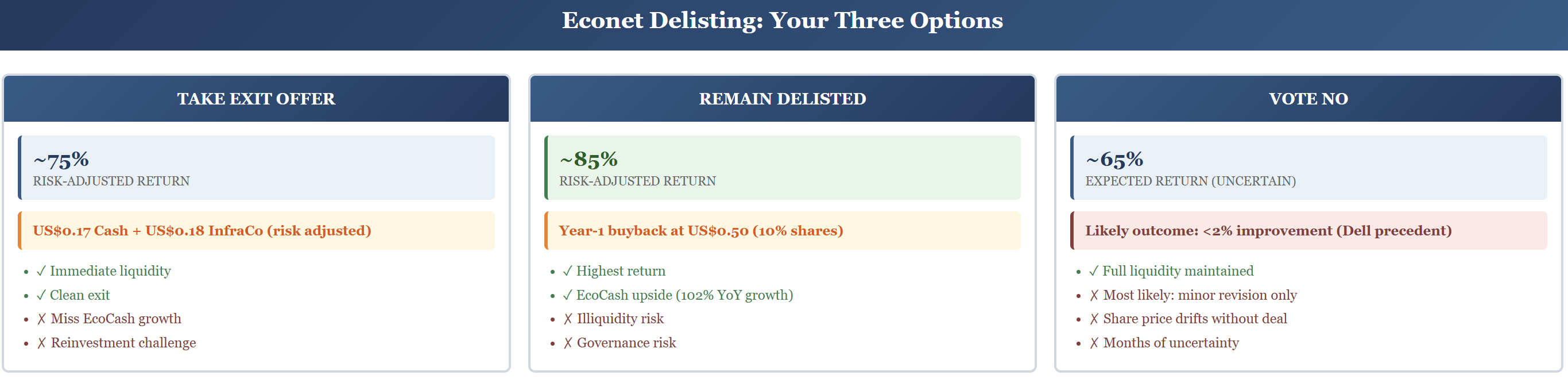 The opportunity is that a “no” vote could force Econet back to the table with a better offer. The risk is equally straightforward: it might not. And unlike the other two paths, there is no defined timeline. There could be months of waiting before anything moves.