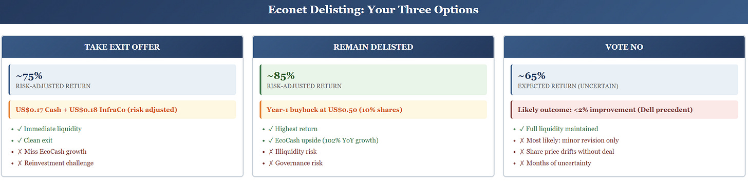 The approach that produces the best risk-adjusted outcome across all three considerations is probably a hybrid — take the exit offer on a portion of your shares to lock in liquidity, while retaining the rest in the delisted Econet to participate in the year-one buyback and the long-term growth story.