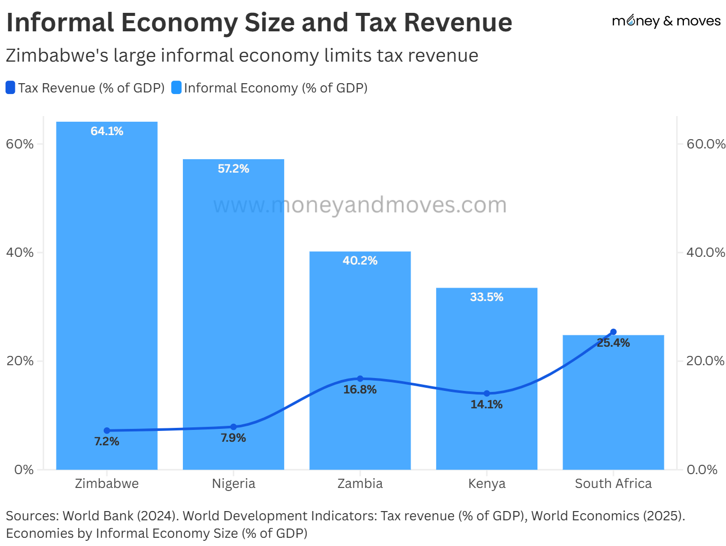 As shown below, Zimbabwe has the highest level of economic informalisation at 64.1% and the lowest tax revenue-to-GDP ratio at 7.2%.