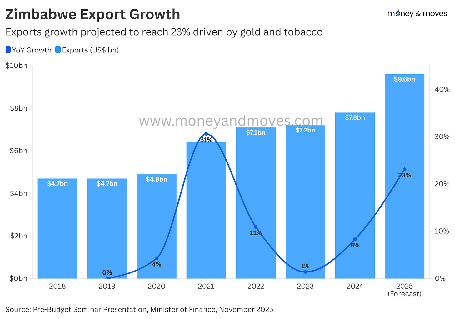 Zimbabwe’s export figures tell the story. Total exports are on track to reach roughly USD 9–10 billion, up 23% driven by gold and tobacco.