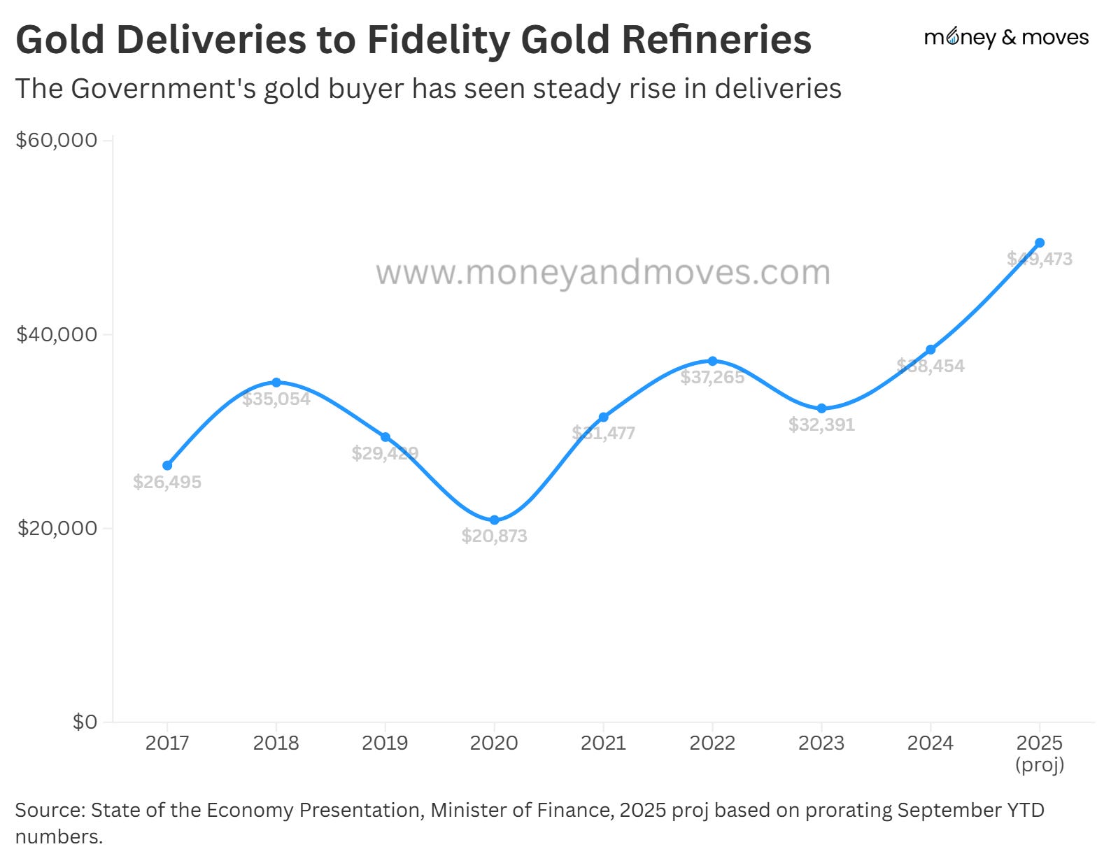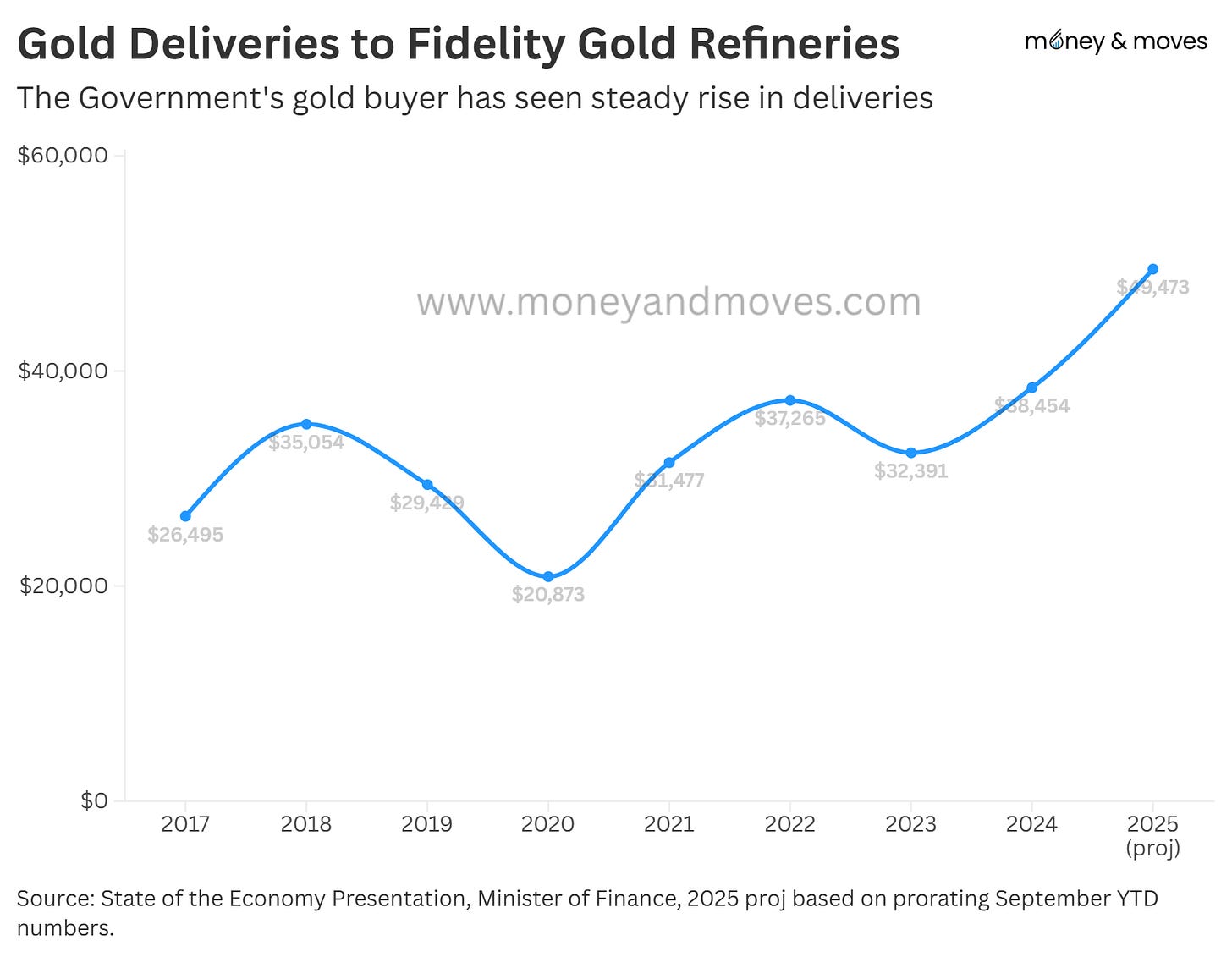 The catalyst has been record gold prices and a steady rise in gold production. The following shows deliveries of Gold to Fidelity, Zimbabwe’s official buyer, on behalf of the government.