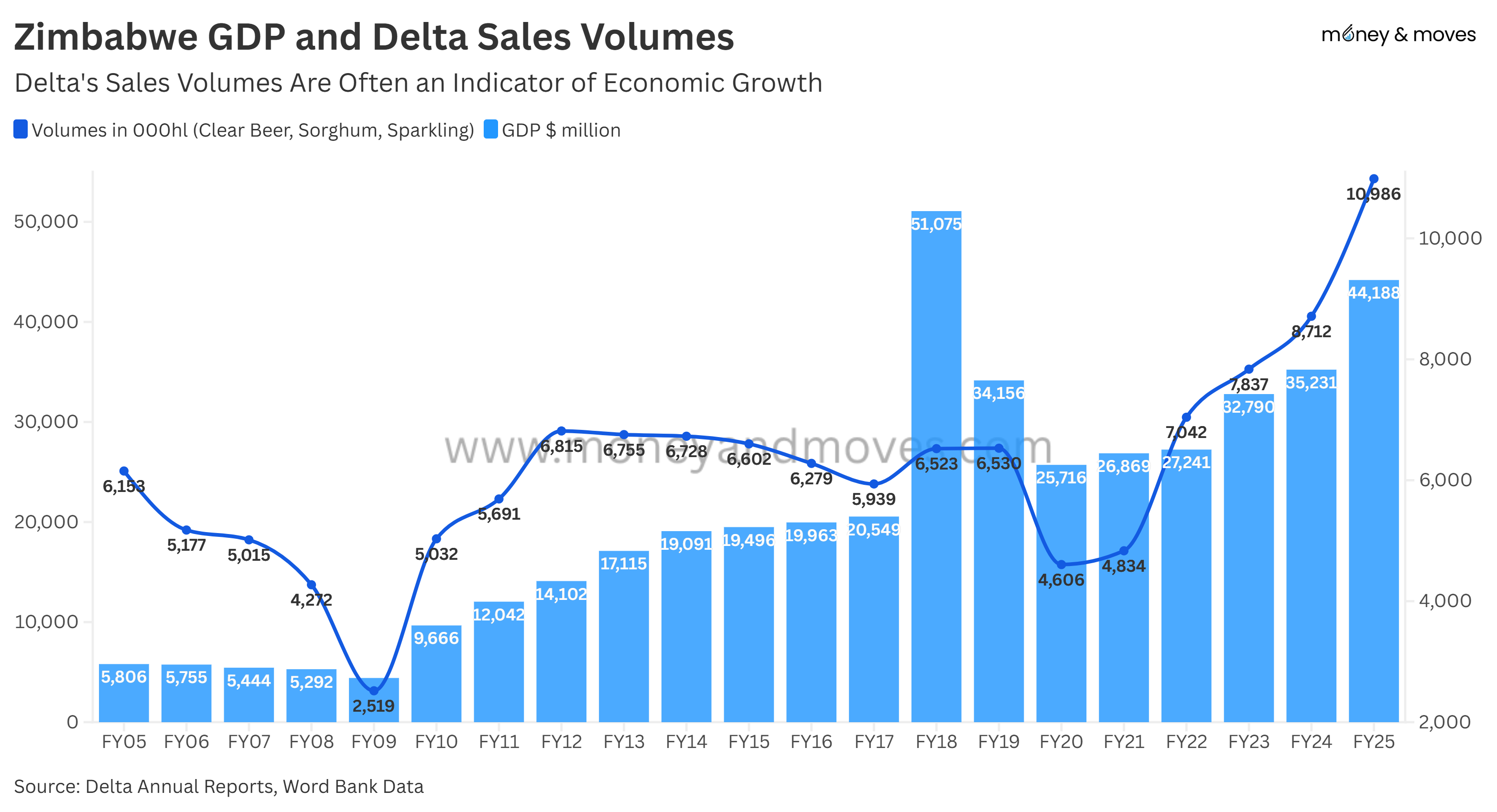 With this in mind, I pulled Delta’s sales volumes over the last 20 years for Zimbabwe and layered them against GDP to cross-check if the economic growth made sense.