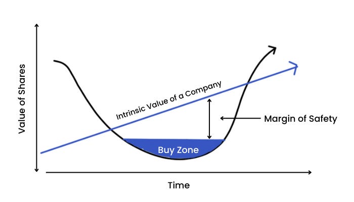 This basically means there should be a gap between what you think the value of the share is and what price you are paying for it today. It’s basically a buffer, like when you tell your unreliable friend the party starts at 1:30 pm when the real time is 2:00 pm.