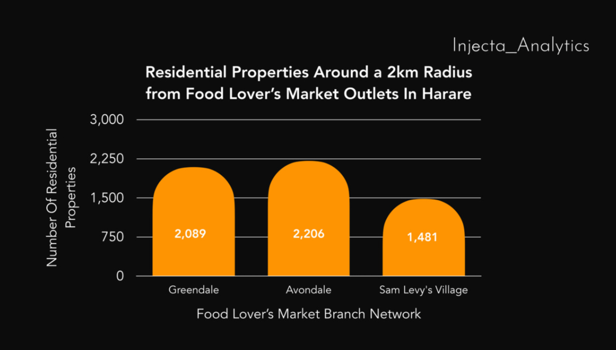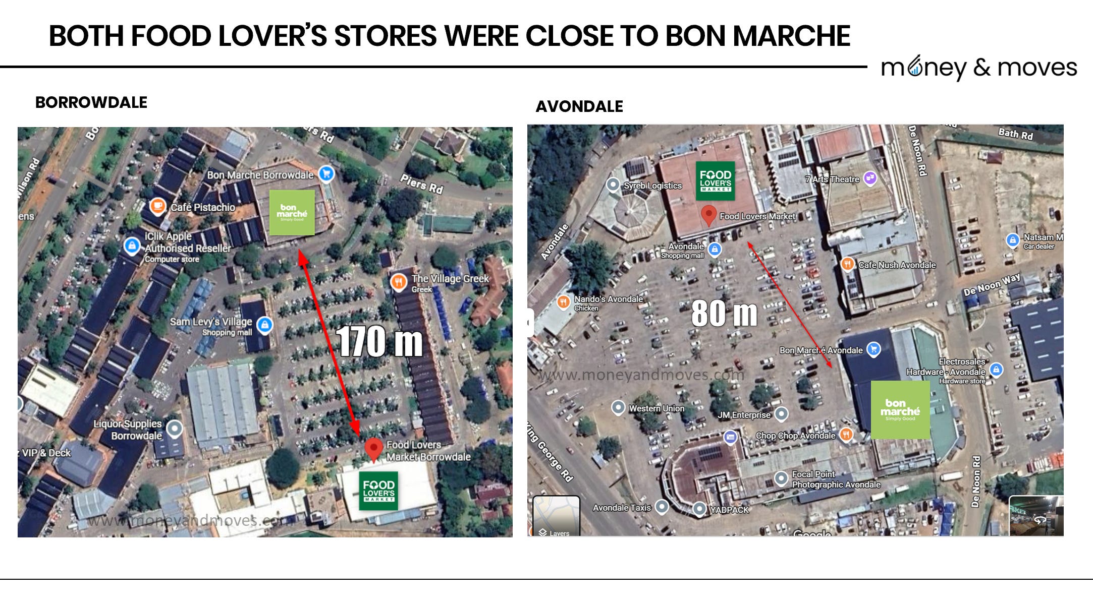 As shown in the image below. Both Food Lover’s Avondale and Borrowdale were located less than 200 meters from a Bon Marché.
