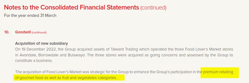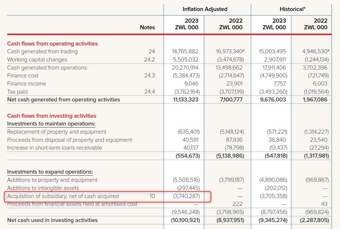 Determining how much OKZ paid for Food Lover’s is not easy from public information as the financial statements hightlight a cash outflow of ZWL 3.7 billion for the purchase.