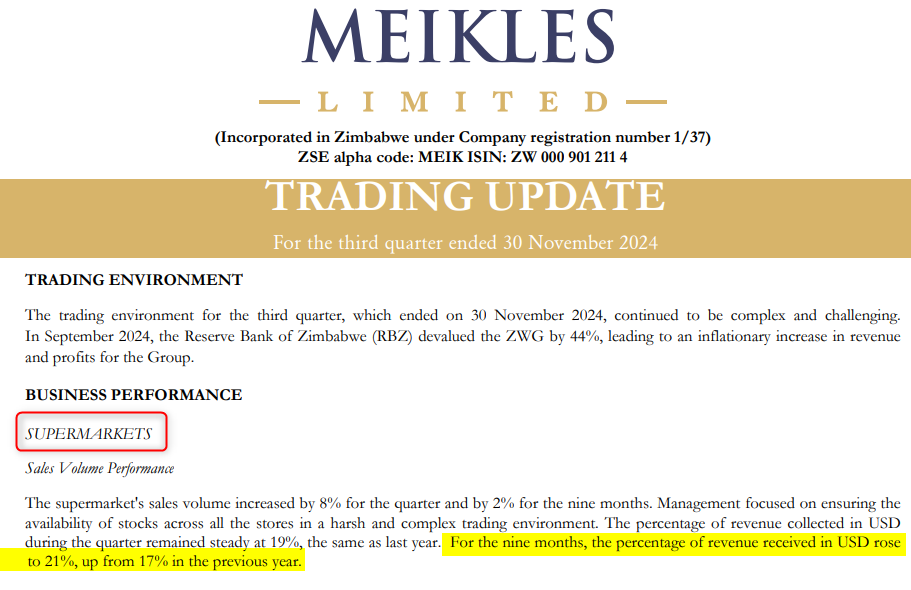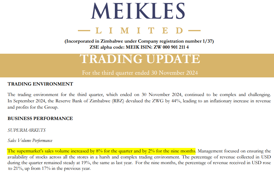Meikles' latest trading update seemed to suggest the same. The revenue for the three months between September and November 2024 increased by 8% compared to the same period in 2023.