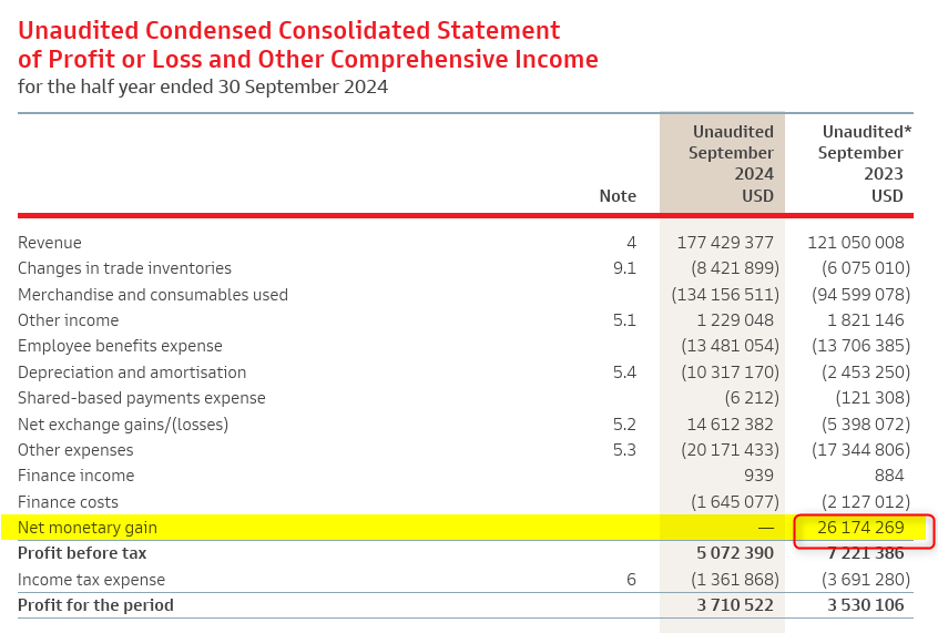 The main problem with the above is the net monetary adjustments. These adjustments are paper gains based on hyperinflation accounting.