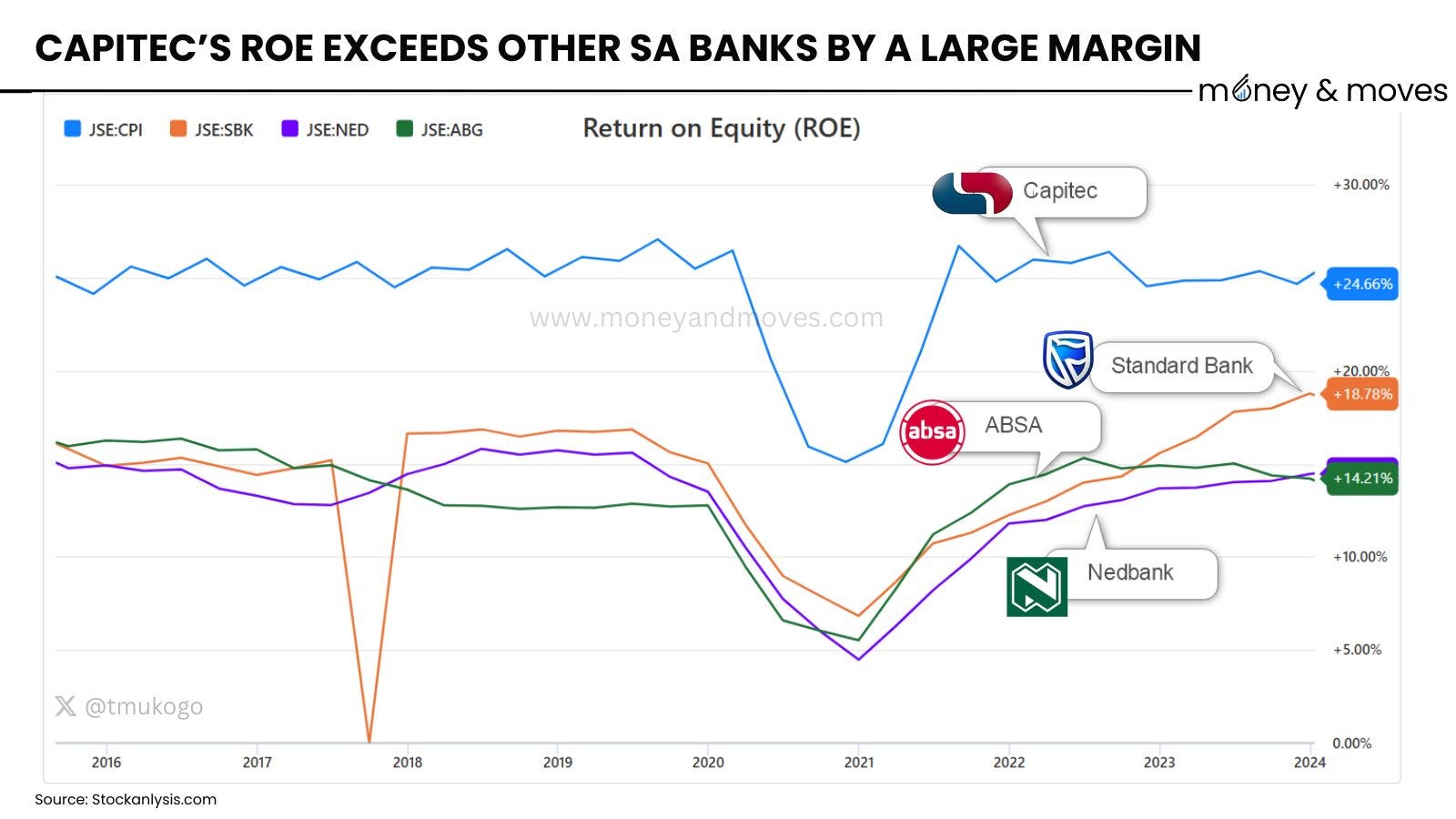 While Capitec, Standard Bank, ABSA, and Nedbank are all banks, the significant gap between Capitec's ROE and the others indicates that it operates with a distinctly different business model.