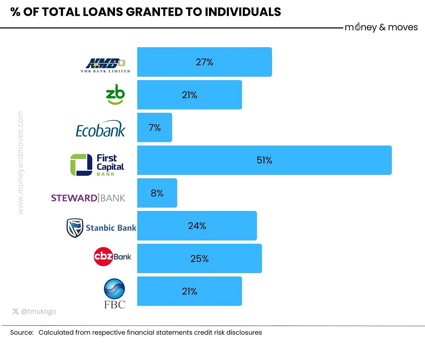 A breakdown of how much Zimbabwean banks lend to individuals vs corporates featuring Steward Bank, CBZ, First Capital, FBC and others.
