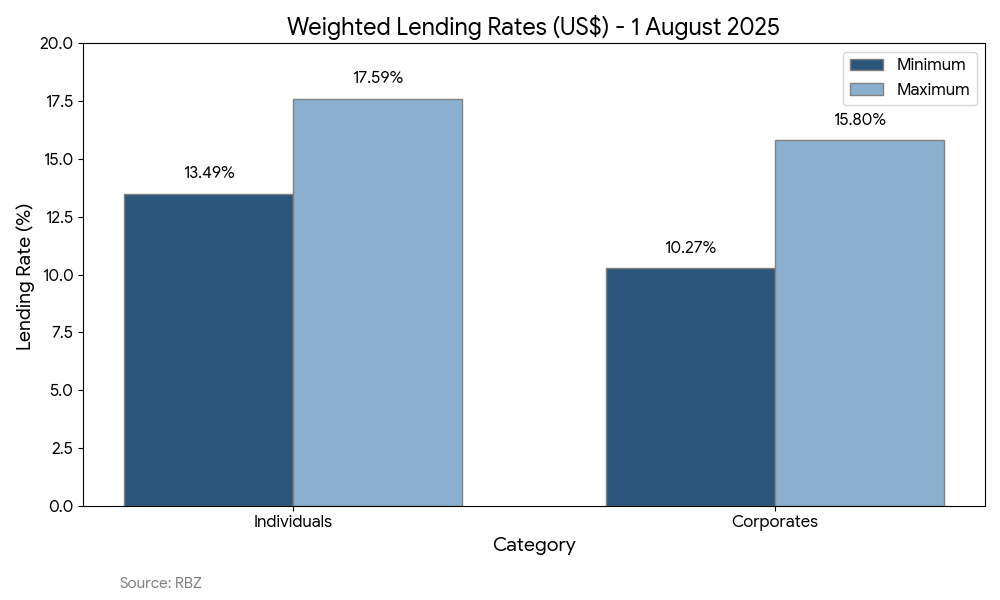 Based on the RBZ data from August, the average weighted interest rates for banks when lending to individuals ranged from 13.49% to 17.59%, and for businesses, from 10.27% to 15.80%.